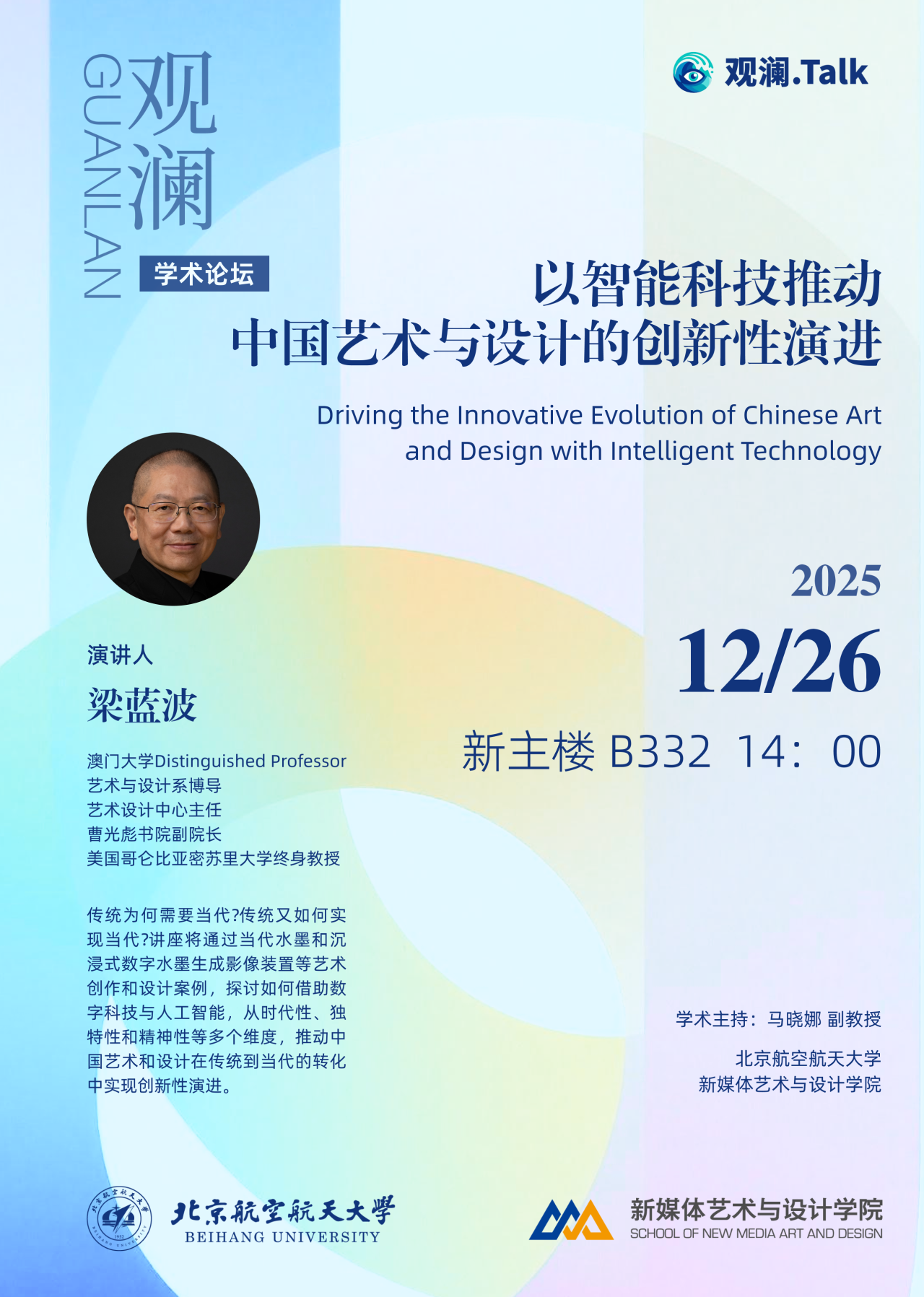 传统为何需要当代?传统又如何实现当代?讲座将通过当代水墨和沉浸式数字水墨生成影像装置等艺术创作和设计案例,探讨如何借助数字科技与人工智能,从时代性、独特性和精神性等多个维度,推动中国艺术和设计在传统到当代的转化中实现创新性演进。