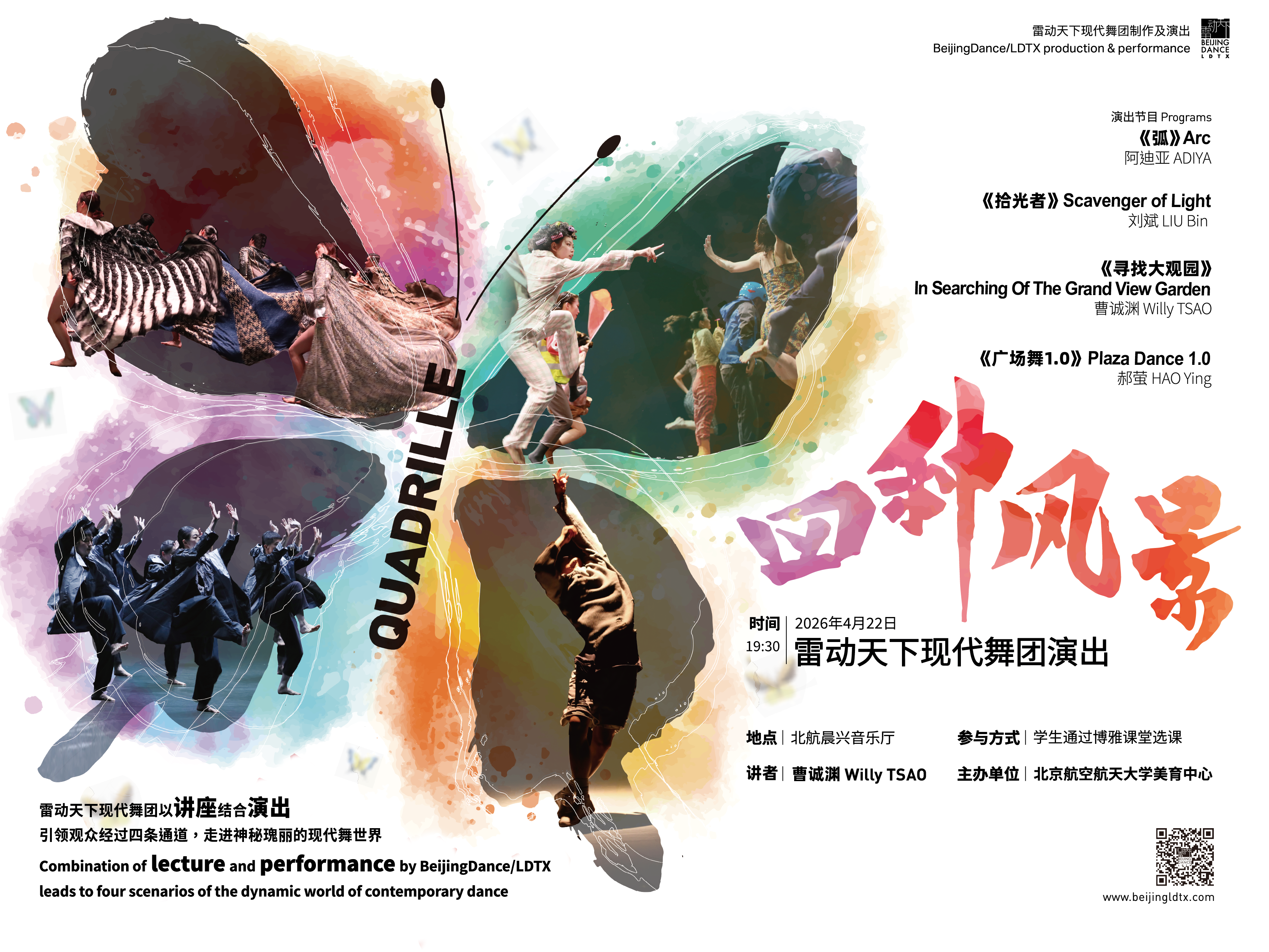 《四种风景》是由雷动天下现代舞团艺术总监曹诚渊先生策划的⼀台节目,通过讲座结合演出的方式,引领观众走进神秘瑰丽的现代舞世界。节目引用四条不同层次的通道带领观众欣赏现代舞,通道为:“身体共鸣”、“心灵感受”、“理智阅读”和“世情游历”。舞团的专业舞者们演出四部作品《弧》《拾光者》《寻找大观园》《广场舞1.0》的选段,分别展示四条通道所指向不同的舞蹈风景。