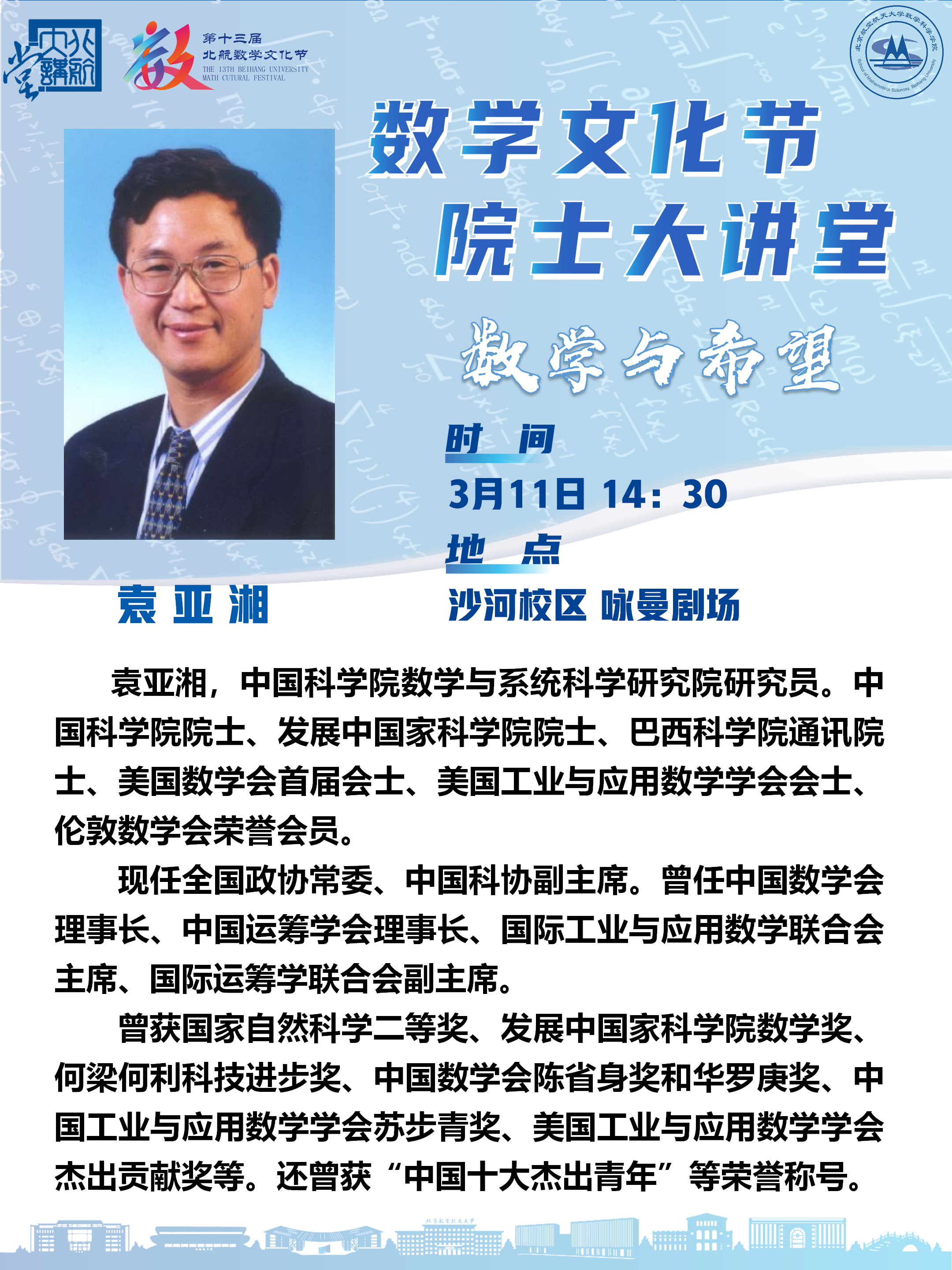 2026年国际数学日(IDM2026)以“数学与希望”(Mathematics and Hope)为主题,旨在探讨数学作为人类最普遍的财富之一,如何为我们在复杂世界中提供理性的光芒与面向未来的信心。本次演讲将带领听众穿越古今,从泰勒斯的名言出发,深度解读数学与希望的内在联系。