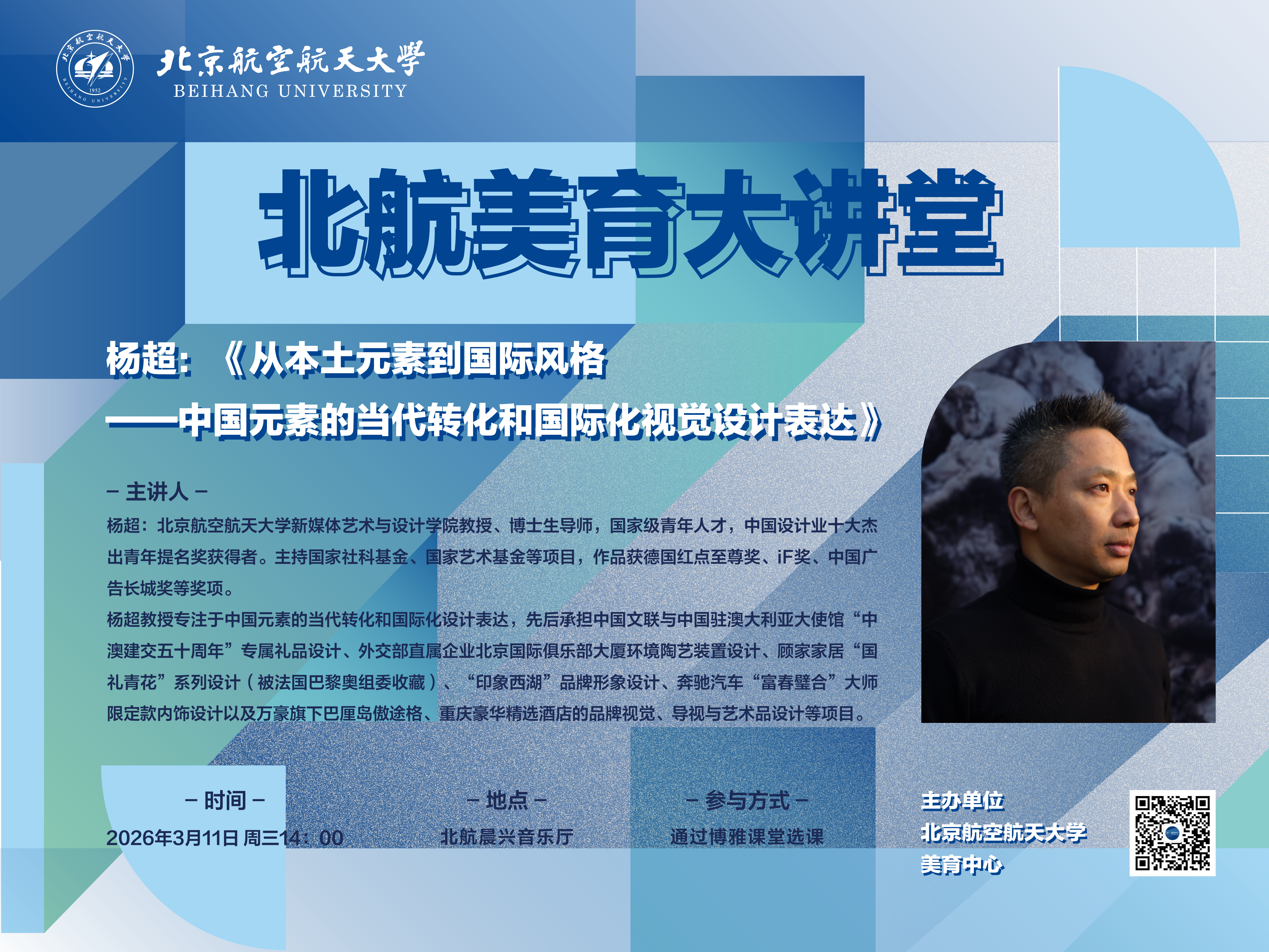 北京航空航天大学新媒体艺术与设计学院教授、博士生导师,国家级青年人才,中国设计业十大杰出青年提名奖获得者。主持国家社科基金、国家艺术基金等项目,作品获德国红点至尊奖、iF奖、中国广告长城奖等奖项。杨超教授专注于中国元素的当代转化和国际化设计表达,先后承担中国文联与中国驻澳大利亚大使馆“中澳建交五十周年”专属礼品设计、外交部直属企业北京国际俱乐部大厦环境陶艺装置设计、顾家家居“国礼青花”系列设计(被法国巴黎奥组委收藏)、“印象西湖”品牌形象设计、奔驰汽车“富春璧合”大师限定款内饰设计以及万豪旗下巴厘岛傲途格、重庆豪华精选酒店的品牌视觉、导视与艺术品设计等项目。