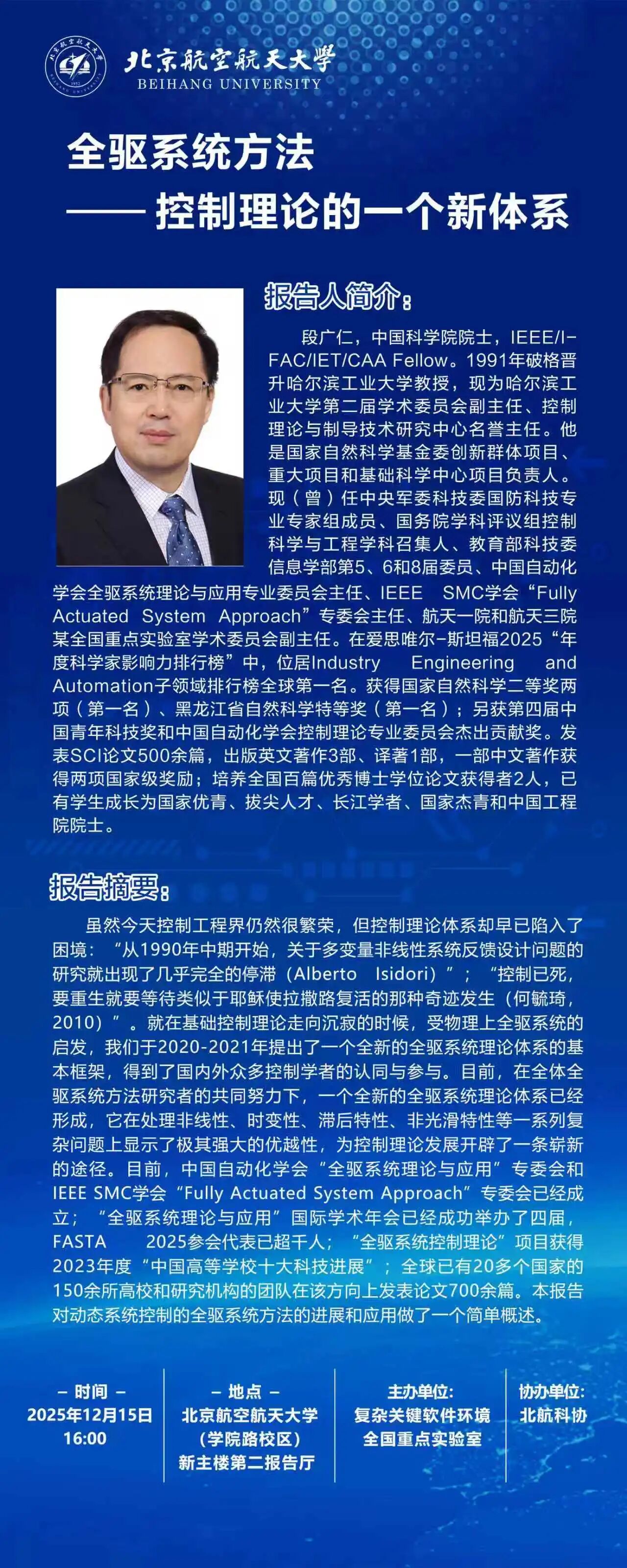 段广仁,中国科学院院士,IEEE/IFAC/IET/CAA Fellow。1991年破格晋升哈尔滨工业大学教授,现为哈尔滨工业大学第二届学术委员会副主任、控制理论与制导技术研究中心名誉主任。他是国家自然科学基金委创新群体项目、重大项目和基础科学中心项目负责人。现(曾)任中央军委科技委国防科技专业专家组成员、国务院学科评议组控制科学与工程学科召集人、教育部科技委信息学部第5、6和8届委员、中国自动化学会全驱系统理论与应用专业委员会主任、IEEE SMC学会“Fully Actuated System Approach”专委会主任、航天一院和航天三院某全国重点实验室学术委员会副主任。在爱思唯尔-斯坦福2025“年度科学家影响力排行榜”中,位居Industry Engineering and Automation子领域排行榜全球第一名。获得国家自然科学二等奖两项(第一名)、黑龙江省自然科学特等奖(第一名);另获第四届中国青年科技奖和中国自动化学会控制理论专业委员会杰出贡献奖。发表SCI论文500余篇,出版英文著作3部、译著1部,一部中文著作获得两项国家级奖励;培养全国百篇优秀博士学位论文获得者2人,已有学生成长为国家优青、拔尖人才、长江学者、国家杰青和中国工程院院士。